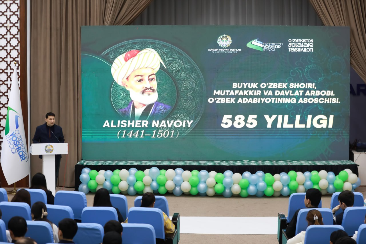 Urganch shahridagi Yoshlar markazida viloyat Yoshlar ishlari boshqarmasi, O’zbekiston yoshlar ittifoqi viloyat Kengashi va O’zbekiston bolalar tashkiloti hududiy bo‘limi tomonidan 9-fevral-buyuk mutafakkir, shoir va davlat arbobi, so‘z mulkining sultoni Alisher Navoiy tavalludining 585 yilligiga bag‘ishlab ma’naviy-ma’rifiy tadbir tashkil qilindi.